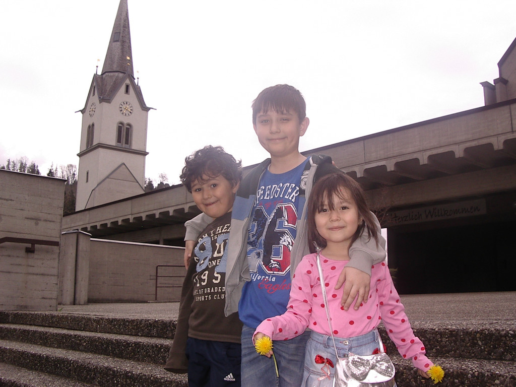 Kirchplatz: Erkay, Ergi und Huma-Selin.