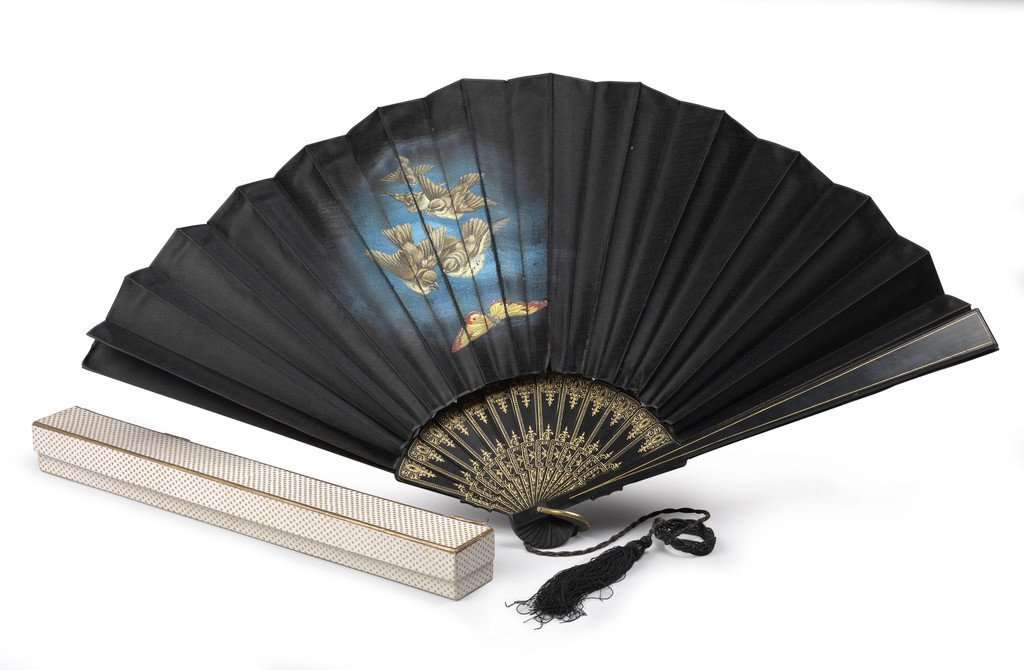 Kaiserin Elisabeth von Österreich - Persönlicher Trauerfächer mit eigenhändiger Bemalung ihrer Tochter Erzherzogin Marie Valerie, schwarzes Holzgestell mit goldgeprägtem ornamentalem Dekor, schwarzes Seidenblatt mit handgemalten Spatzen und Schmetterling, signiert "MV" (Marie Valerie), Länge 37 cm, anhängend schwarze Kordel, in Kartonetui des k. u. k. Hoflieferanten Franz Krejci, Unterseite mit Inventarnummer, um 1890, (Lu)