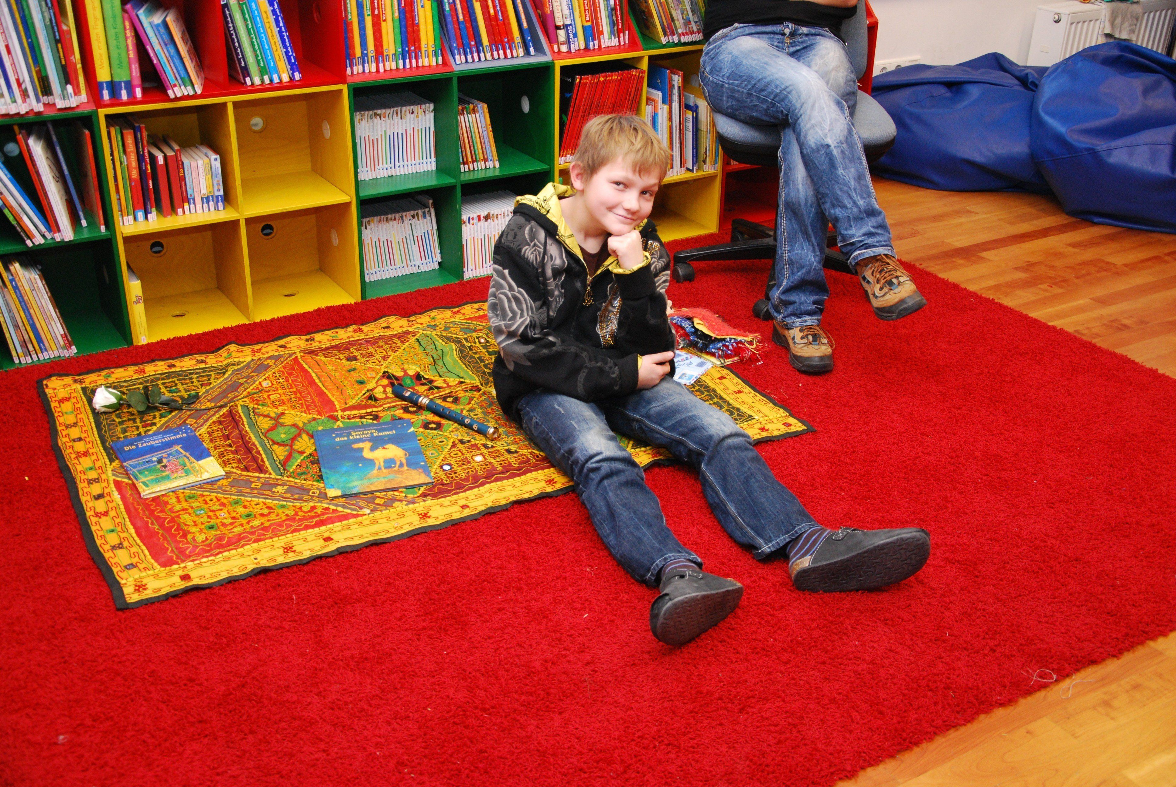 Am Schluss konnten die Schüler selber am Geschichtenteppich lauschen.