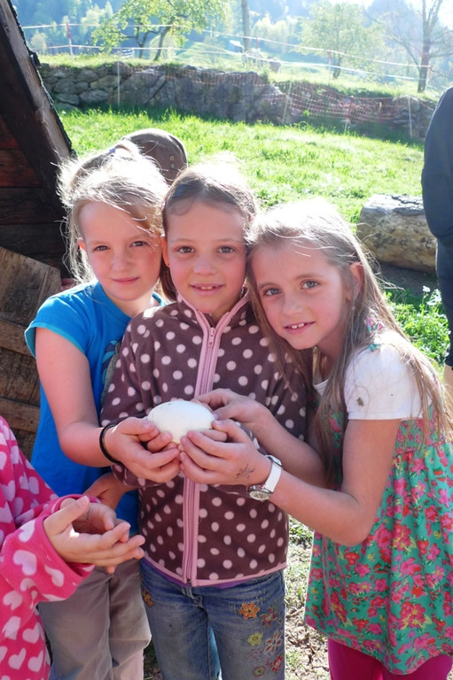 Nea, Christina und Paula halten ein Höckergansei.