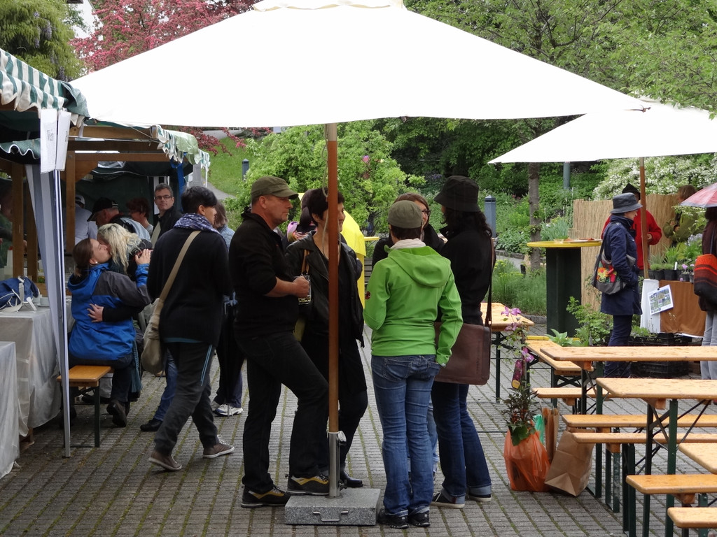 Gut beschirmt gegen den Mairegen - trotzdem gute Stimmung beim Markt am Gartahag