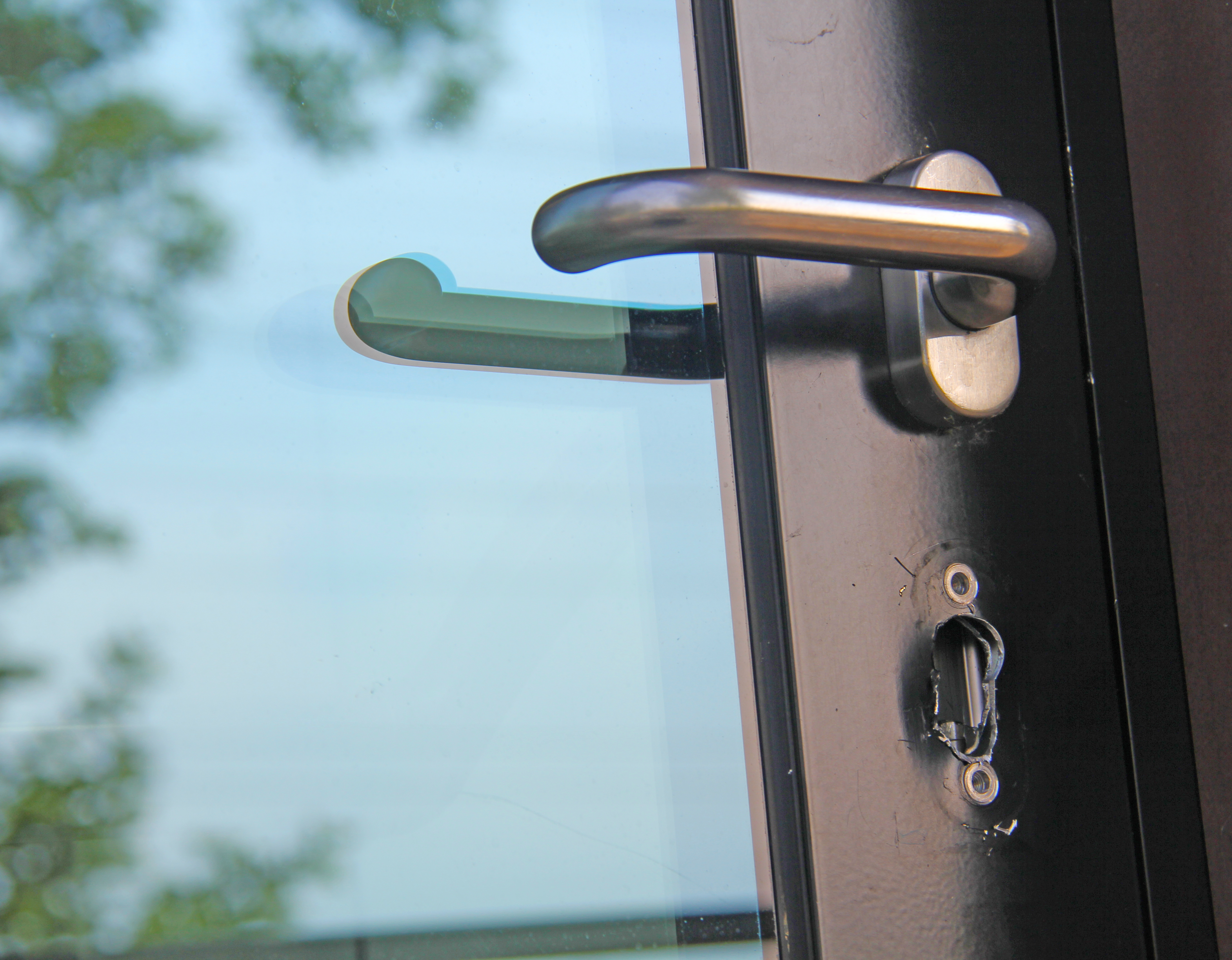 Das Beschädigte Schloss des Hintereingangs.