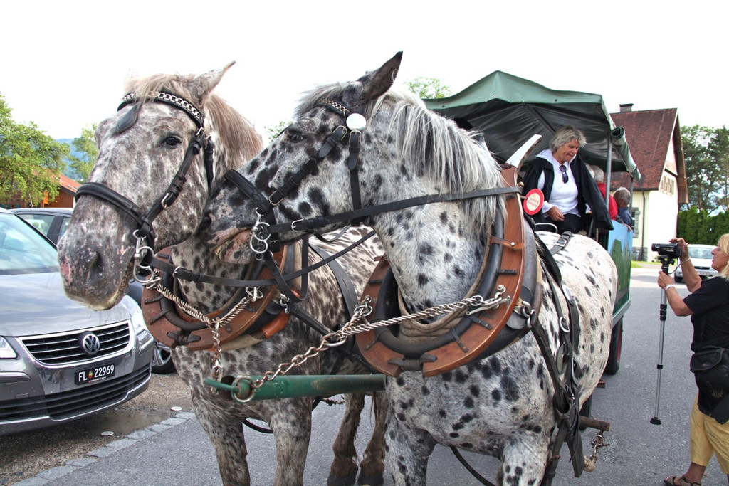 Los ging es ganz romantisch mit der Kutsche von Christine und Johann "Jonny" Stelzcyk und deren beiden Norikern "Peter und Paul".