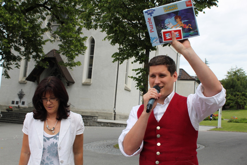 Auktionator Steve Mayr und Obfrau Carmen Nachbaur bei der Versteigerung der Preise.