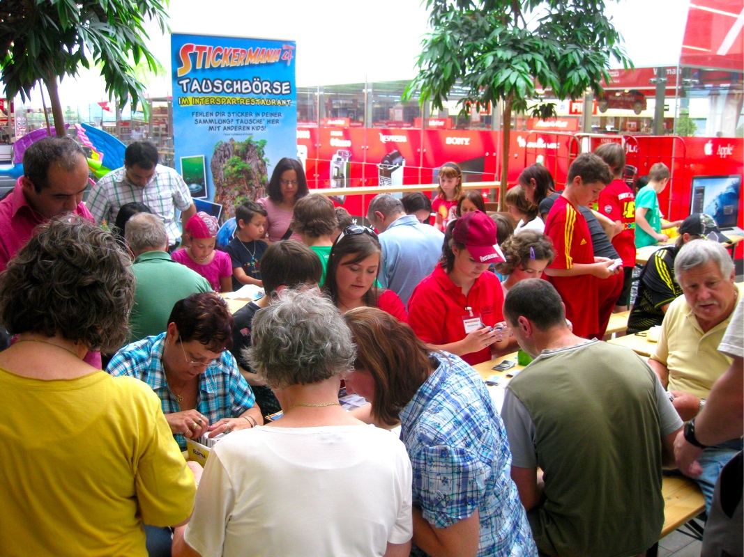 Alle Tische waren belegt mit Sticker-Fans