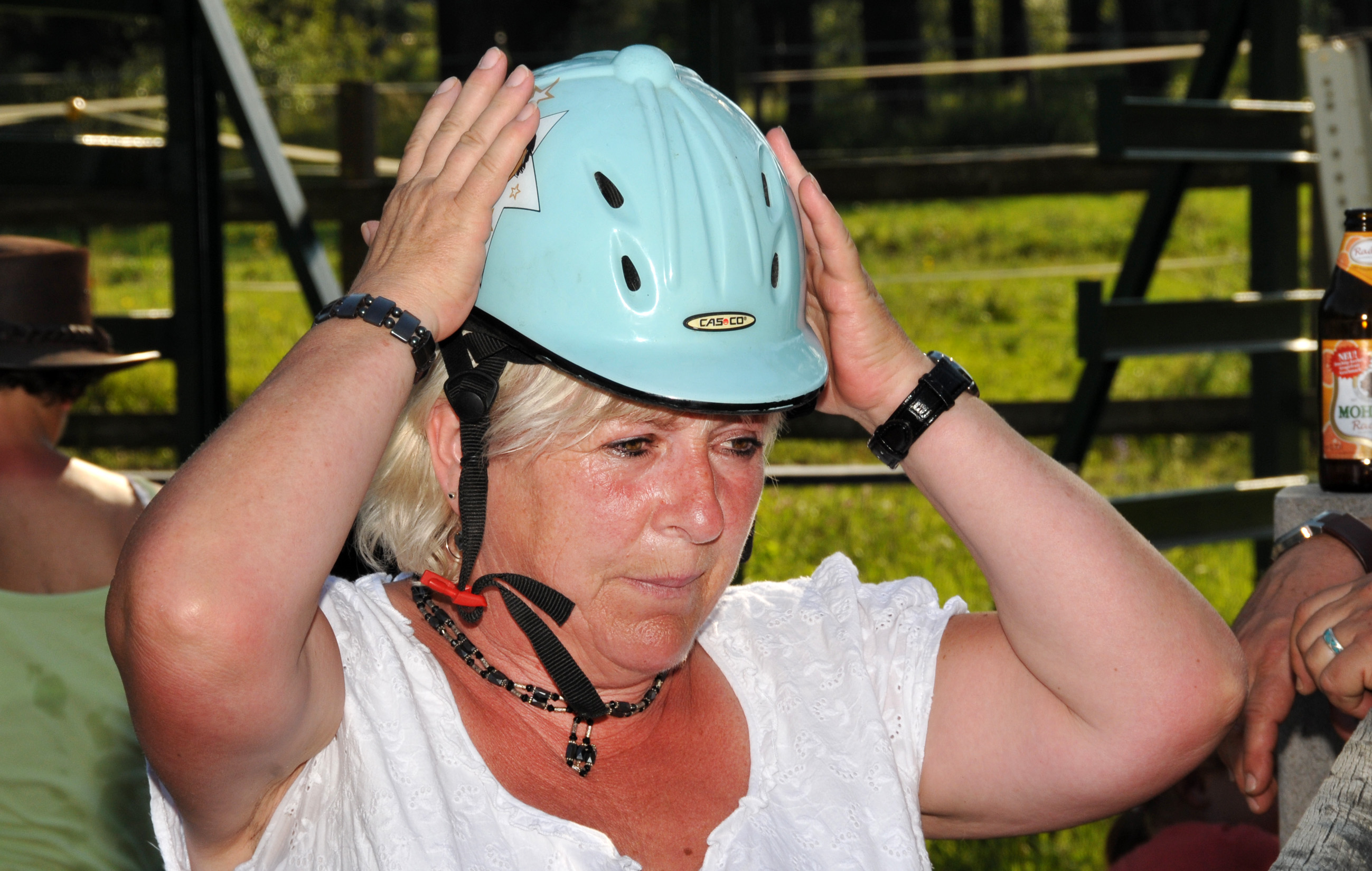 Oma führt den tollen Helm für junge Reiterinnen vor