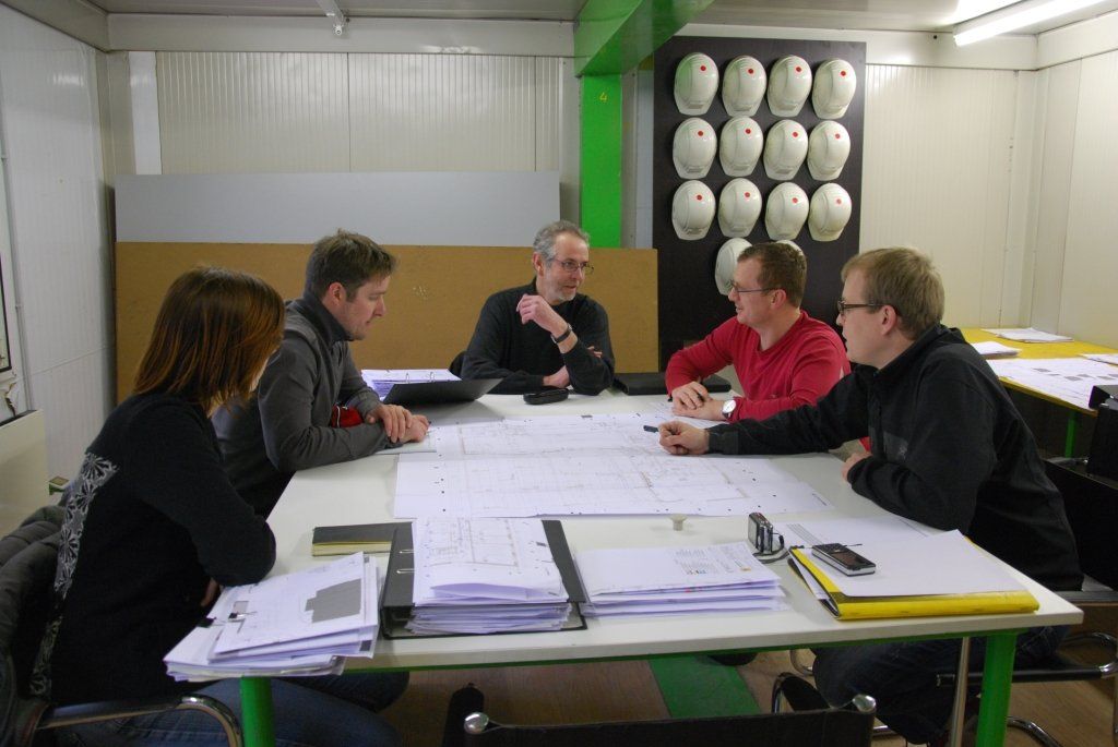 Baubesprechung vor Ort mit v.l.n.r.: Heike Pohl, Marc Hagspiel, Peter Haas, Christoph Albrecht und Martin Skarlet.