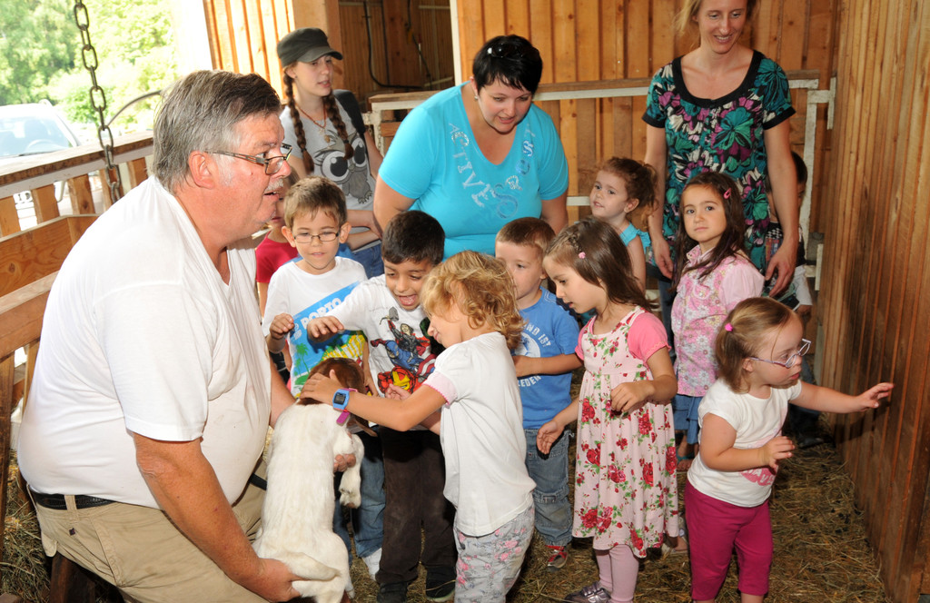 Tierarzt Bruno Fink mit den Kindern im Ziegenstall