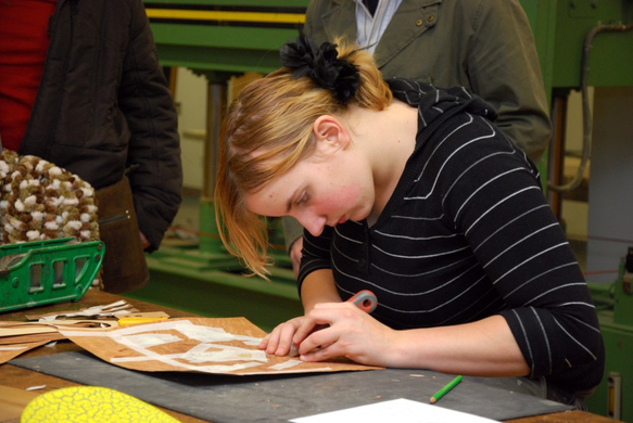 Jeannine ist ganz vertieft in ihre Intarsienarbeit.