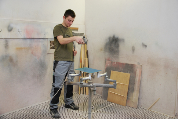 Bruno beim Beizen in der Abteilung Oberflächenbehandlung.