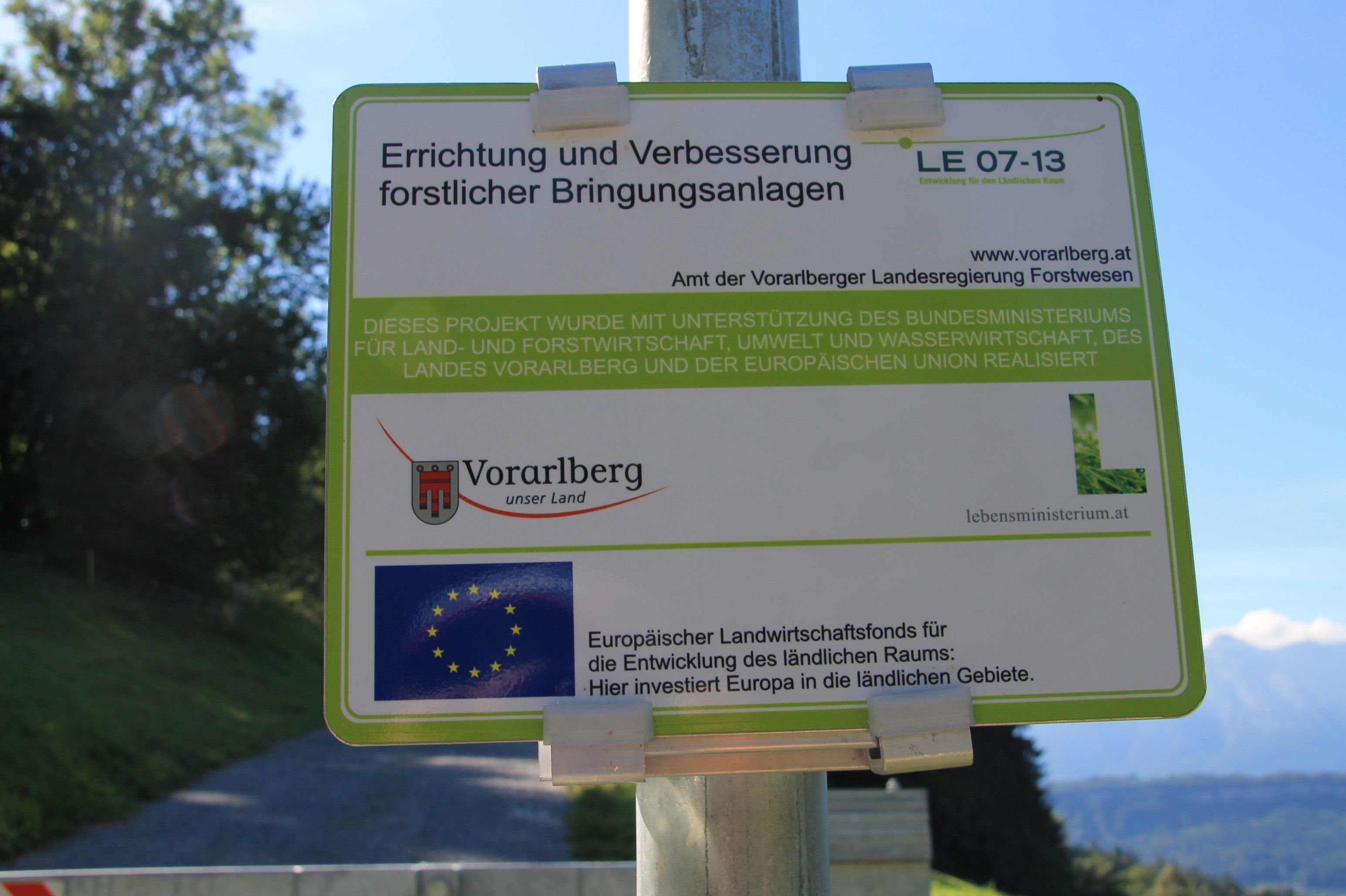 Ein Schild weist auf die Förderung des Forstwegs durch das Land und die Europäische Union hin.
