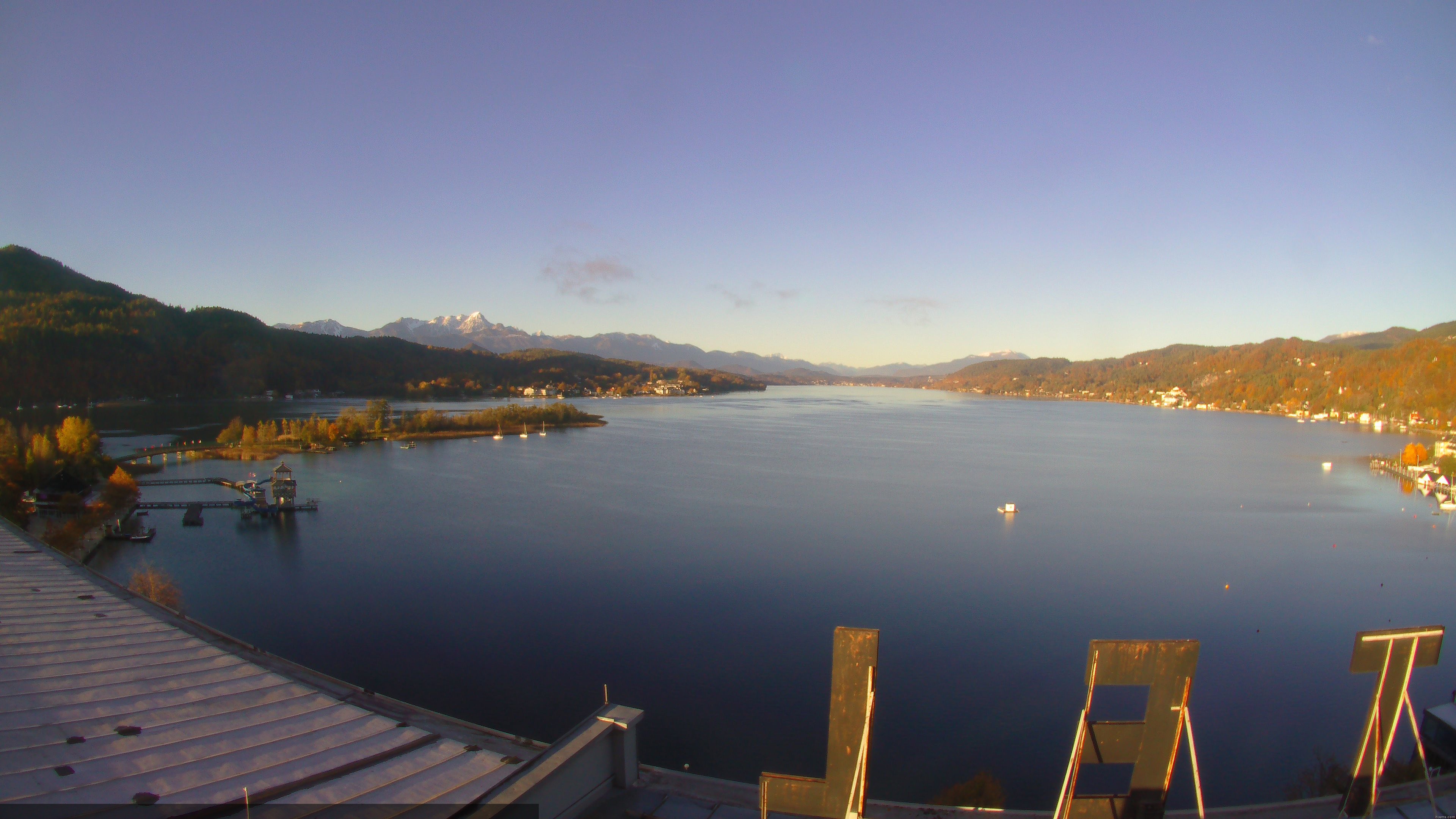 Blick vom Parkhel in Pörtschach nach Osten über den Wörthersee. Webcam auf ca. 437 Meter Seehöhe. (Quelle: www.poertschach.at)