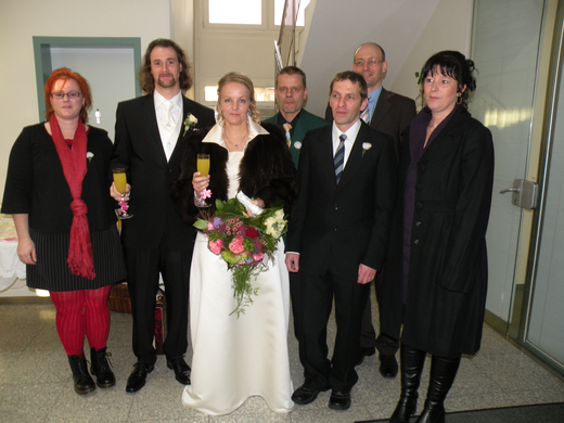 Das Paar mit den Trauzeugen und dem Standesbeamten.