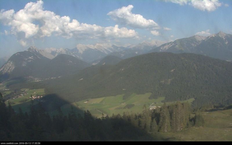 Blick von de Rauthütte über das Leutasch Tal. Webcam auf ca. 1598 Meter Seehöe. (Quelle: www.seefeld-sports.at)