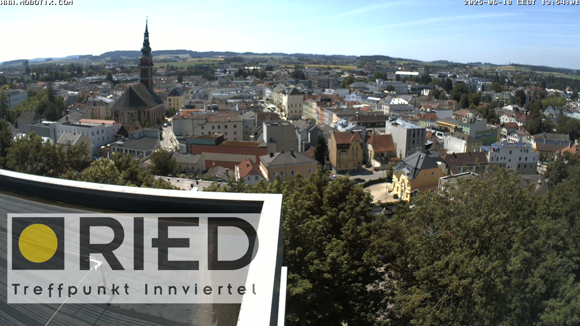Blick auf die Stadt Ried im Innkreis. Webcam auf ca. 439 Meter Seehöhe. (Quelle: http://riedweb.at/webcam/#)