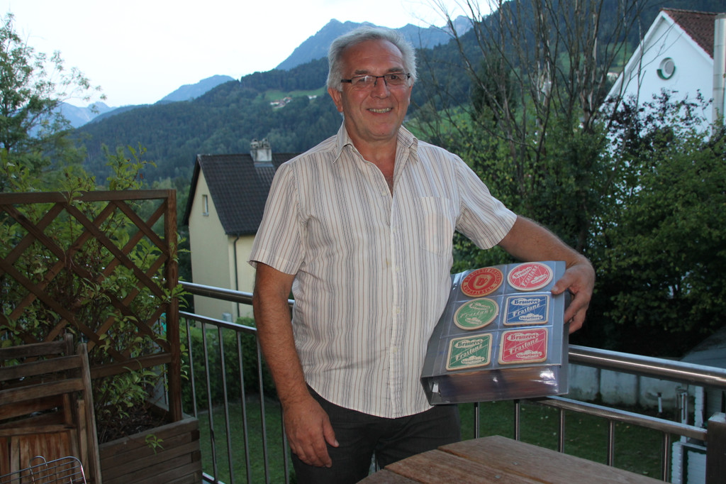 Heribert Gut, pensionierter diözesaner Druckerei-Fachmann, mit seinem Privat-Bierdeckel-Katalog.