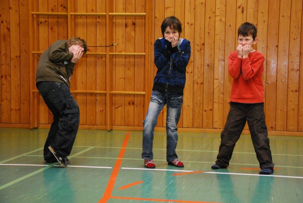 Die Nachwuchsschauspieler stellen Entsetzen dar.