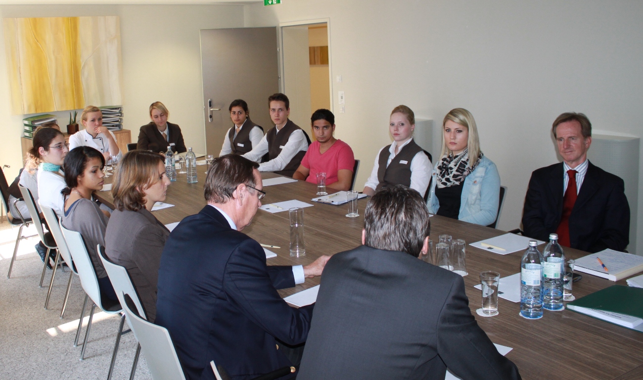 Lehrlingsmeeting mit Wolfgang Juri (Fachgruppengeschäftsführer WK Vorarlberg), Hartmut Geese (Geschäftsführer RIMC Austria), Gerhard Schwendner (Hoteldirektor), Inge Schwendner (Personalleiterin) und Katharina Schöche (Assistentin der Geschäftsführung der RIMC Austria).