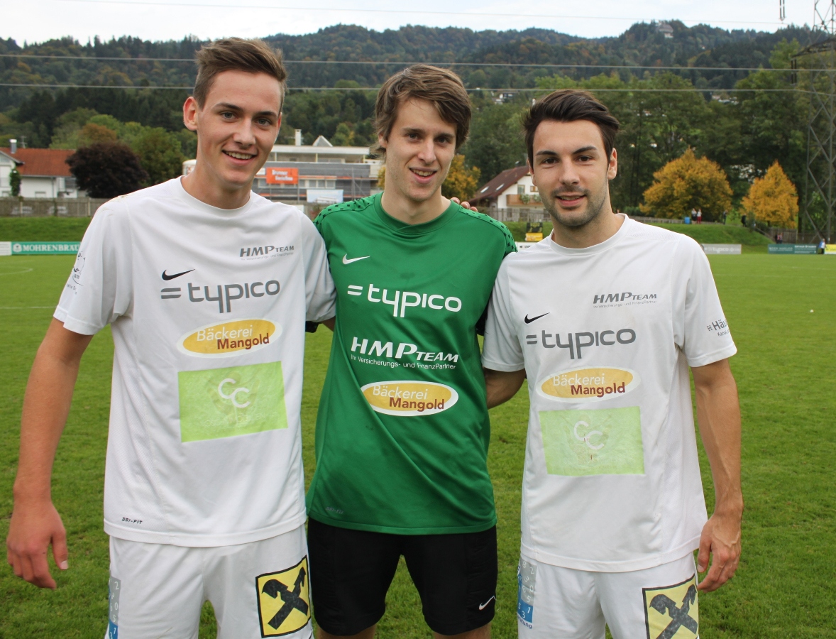 Die Torschützen Bereuter Felix und Wehinger Christoph mit Tormann Lukas Holzner .