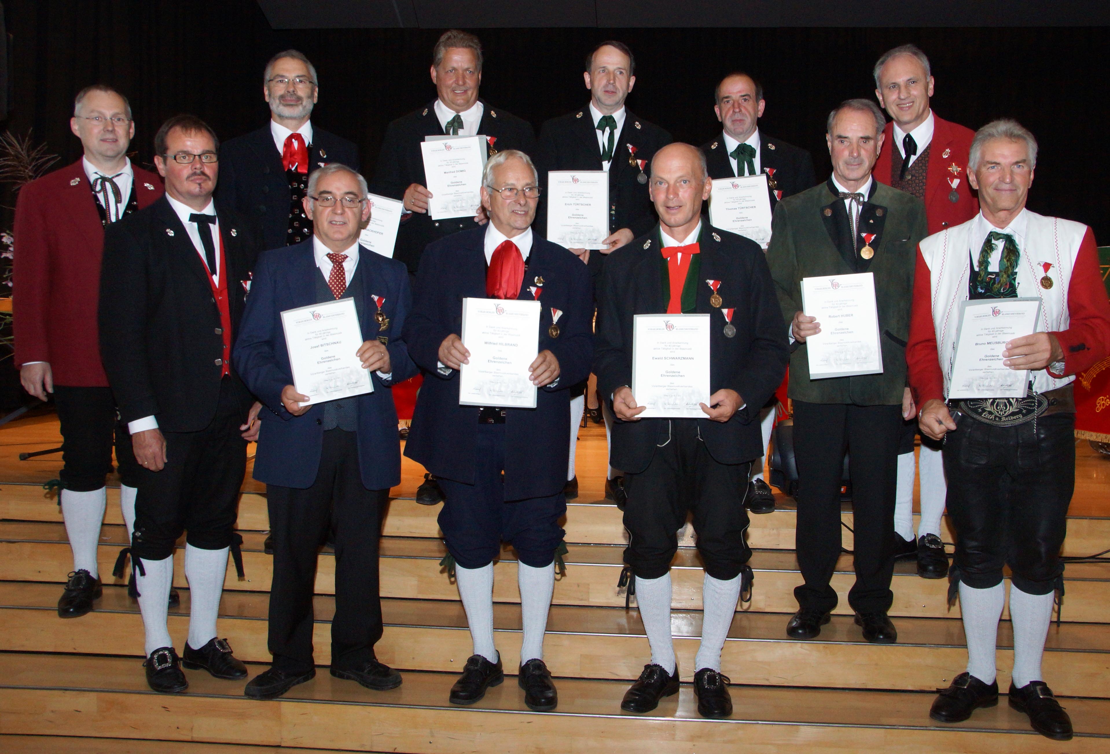 Verdienstmedaille in Gold für 40 Jahre: Josef Bitschnau (Eisenbahnermusik), Manfred Hackhofer, Wilfried Hilbrand (Stadtmusik Bludenz), Martin Schedler (TK Brand), Manfred Domig, Erich Türtscher, Thomas Türtscher (TK Fontanella), Robert Huber, Bruno Meusburger (TK Lech), Reinhard Burtscher * (Fraßenecho Raggal), Reinhard Dünser *, Ewald Schwarzmann (HM Sonntag) * nicht anwesend.