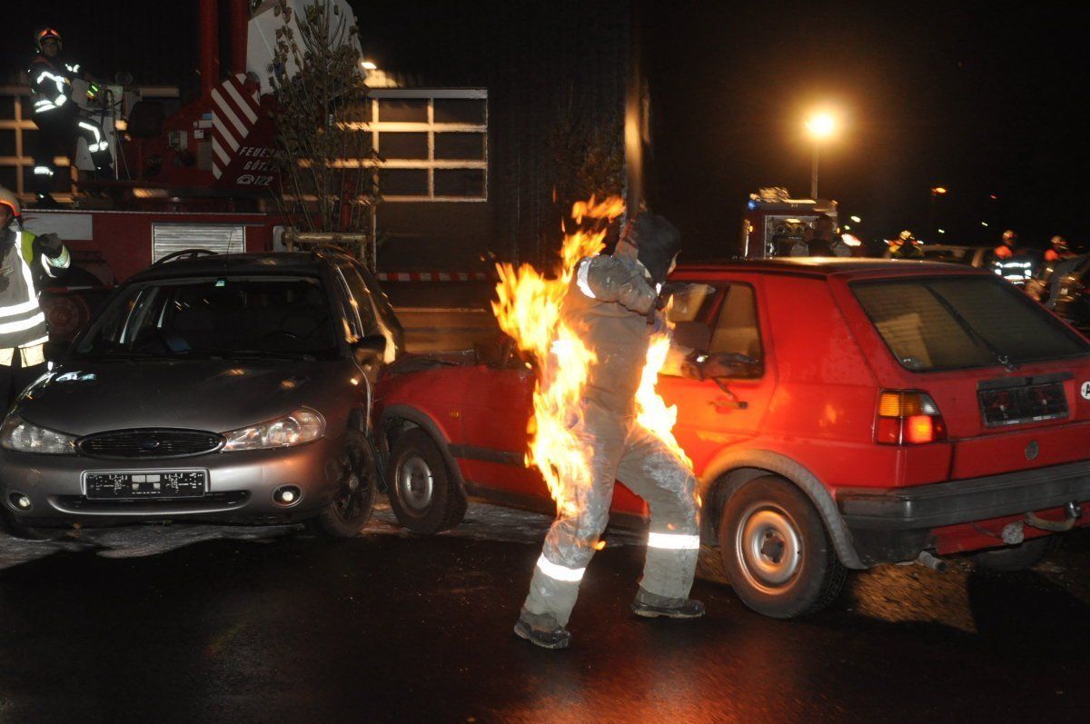 Actionreich: Stuntman Thomas Vogel flüchtete brennend aus dem Auto.