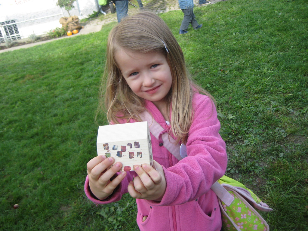 Karolina mit einem Häuschen der Bausteinaktion.