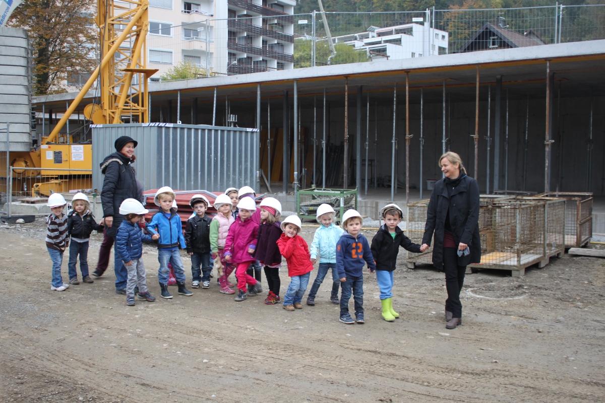 Die Kindergartenkinder bei der Baubesichtigung ihres neuen Kindergartens