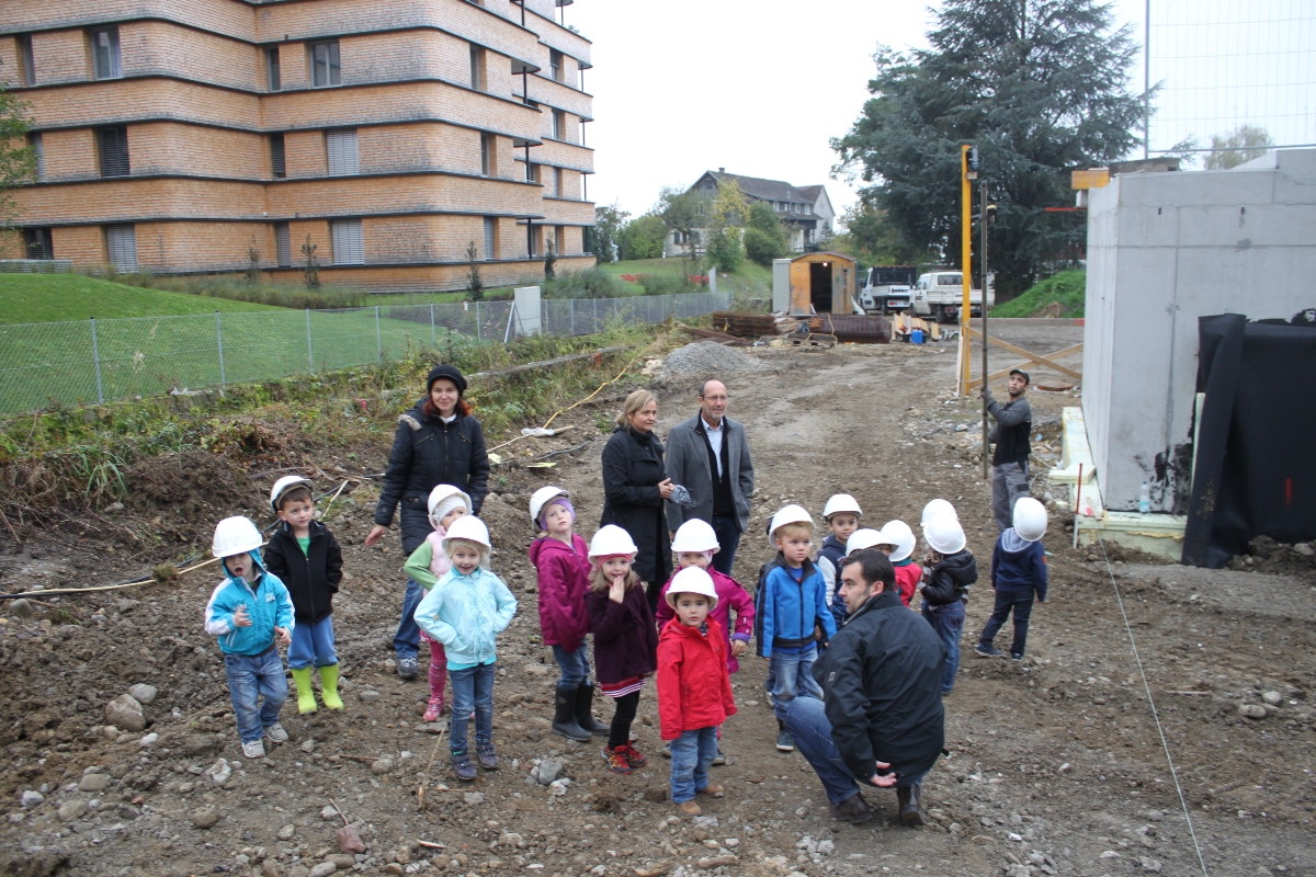 Die Kindergartenkinder bei der Baubesichtigung ihres neuen Kindergartens