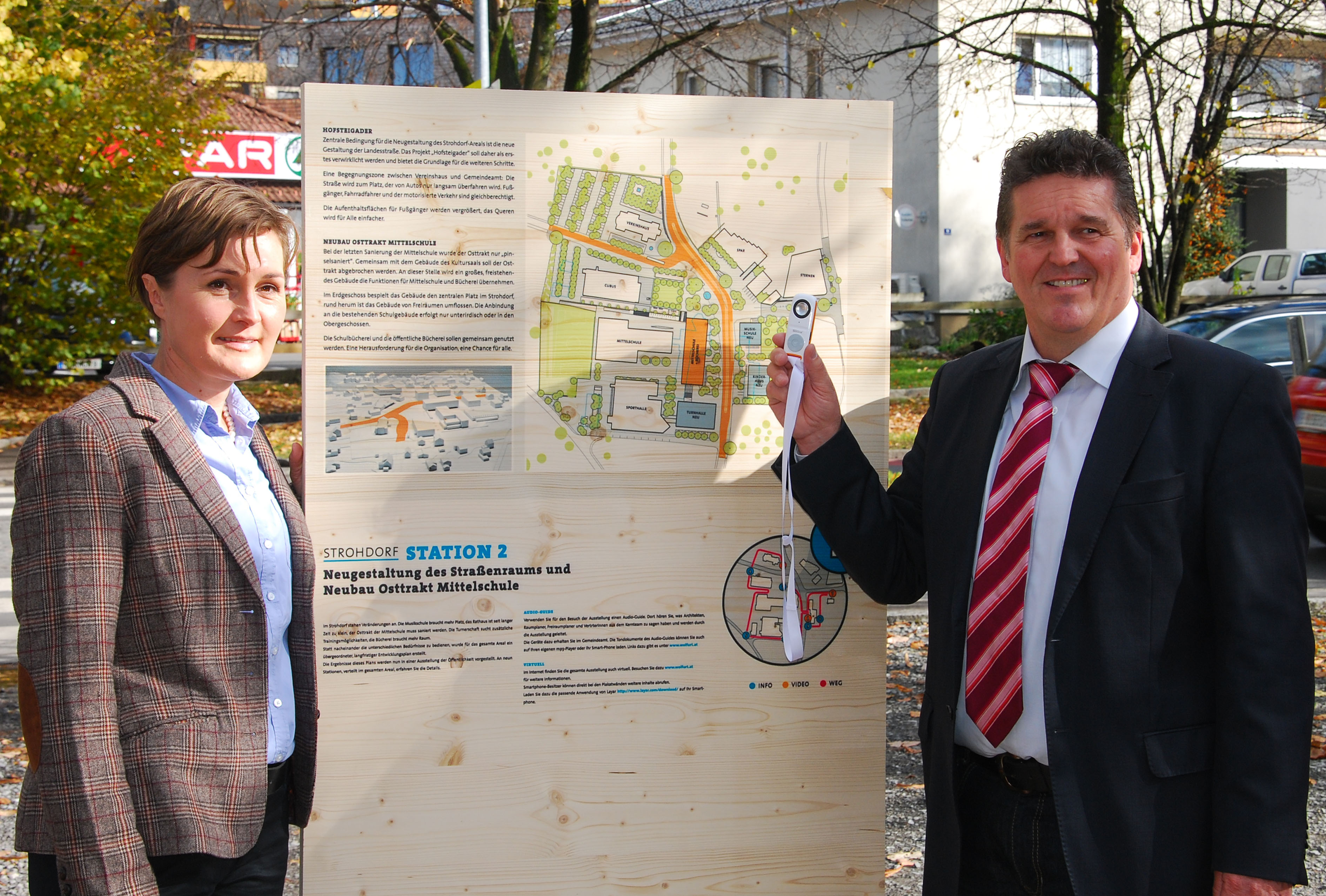 VBgm. Angelika Moosbrugger und Bgm. Christian Natter informieren über die audio-visuelle Ausstellung.