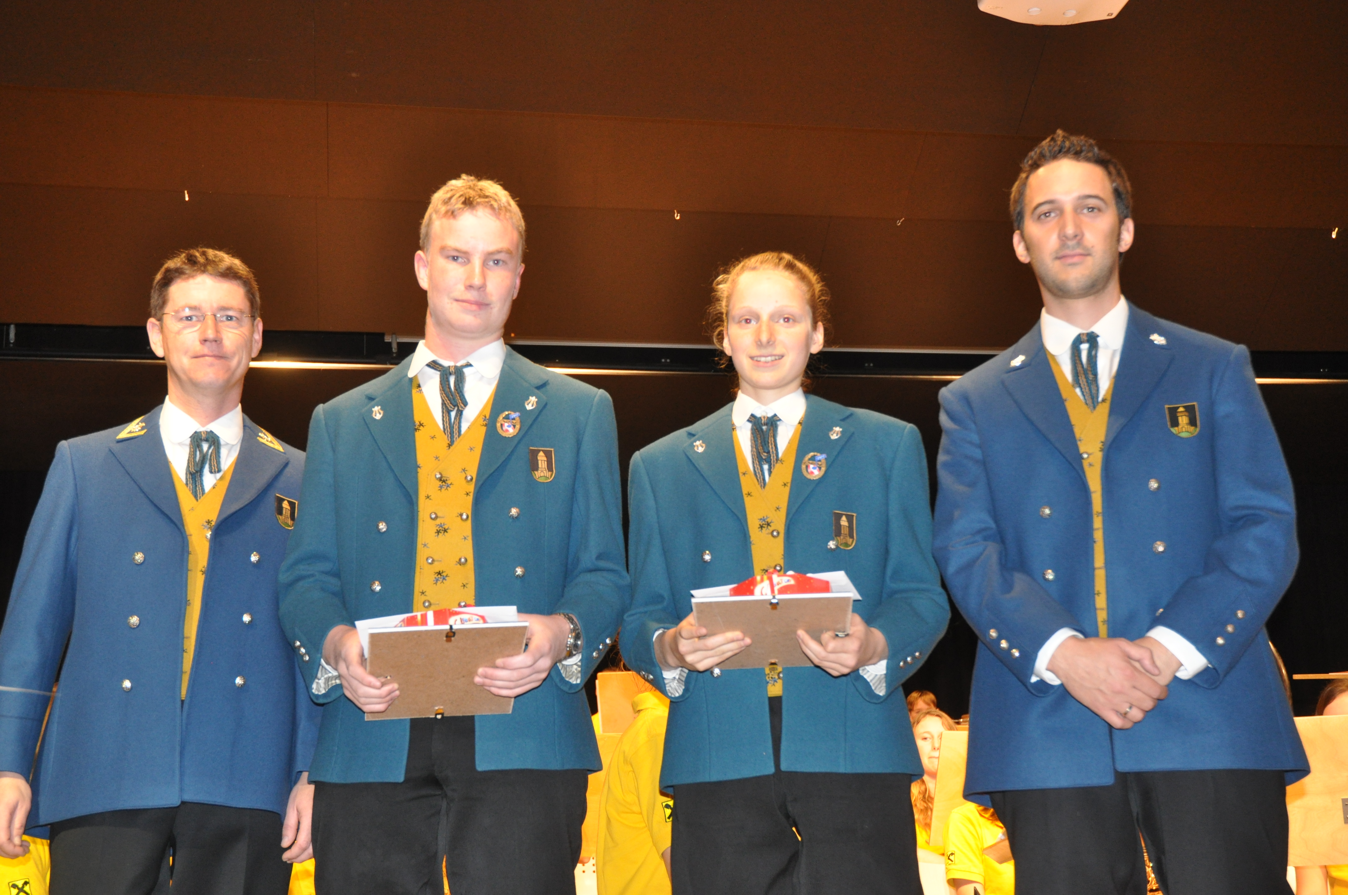 Kapellmeister Emil Pfitscher, Matthias Lampert, Magdalena Halbeisen, Obmann Simon Thöni (v.l.)