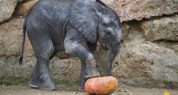 Im Tiergarten Schönbrunn gab es rund um Halloween für die Tiere Kürbis - Elefantennachwuchs Tuluba, die heuer ihren zweiten Geburtstag feierte, freute sich sichtlich über die orange Leckerei. - © Daniel Zupanc