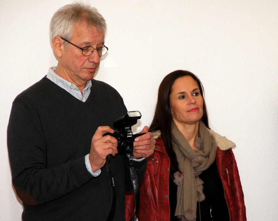 Helmut Gassner und Beate Fischer betrachten die Objekte genau.