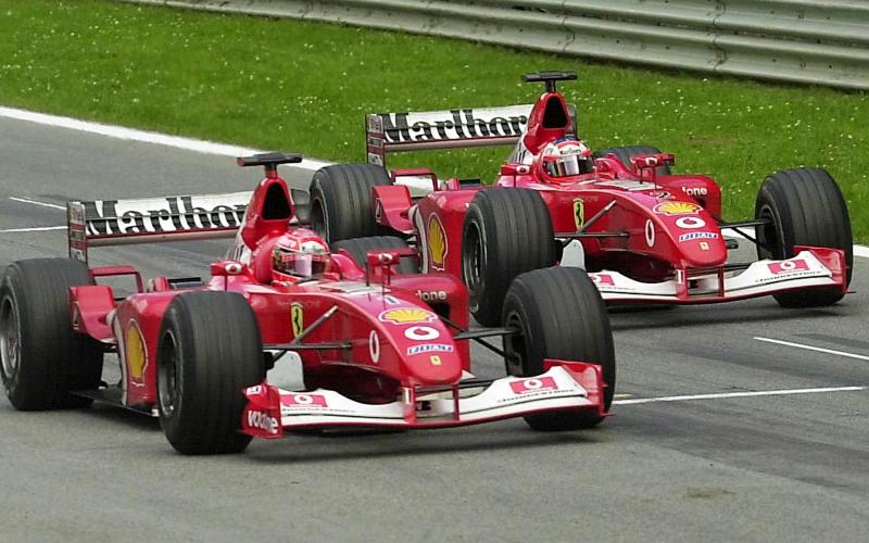 2002: „Let Michael pass fort the championship“, lautete der Ferrari-Funkspruch an Rubens Barrichello, der live im TV zu hören war. Der Brasilianer lässt Schumacher gewähren.