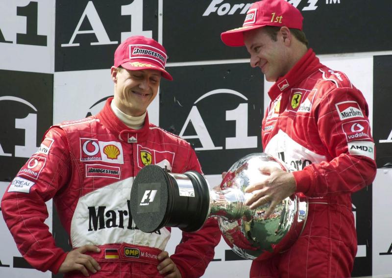 2002: Die Fans buhen Schumacher auf dem Podest aus. Dem Deutschen ist der geschenkte Sieg selbst unangenehm und hat kein Verständnis für die Team-Entscheidung. Schumacher beweist aber Größe und überlässt Barrichello symbolisch den ersten Podest-Platz.