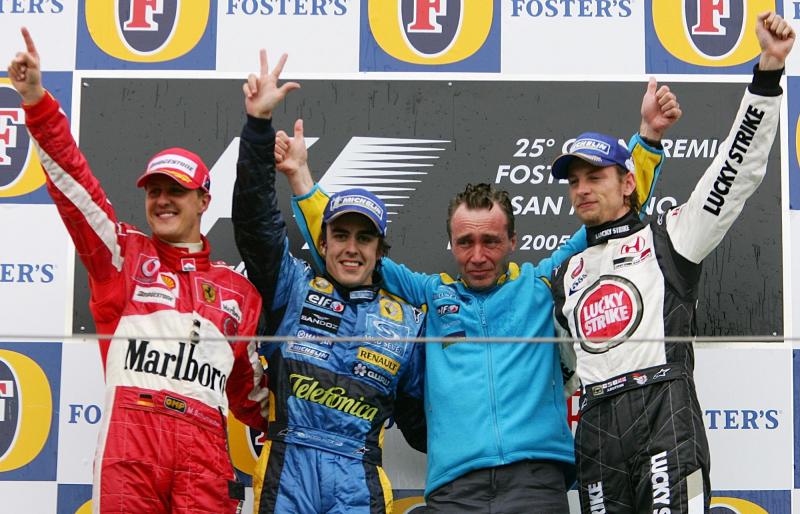 2005: Button steht ebenfalls auf dem Imola-Podest – zu Unrecht: Er wurde im Nachhinein disqualifiziert, der Österreicher Alexander Wurz wird nachträglich dritter.