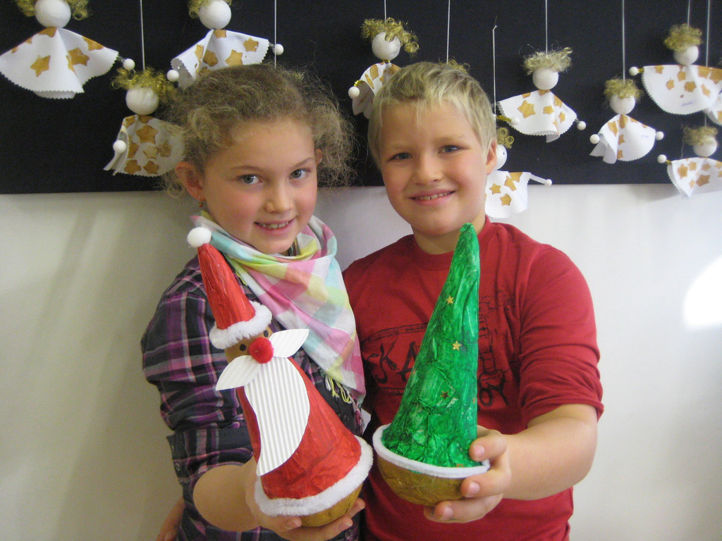 Im Werkunterricht der 2 a Klasse entstehen bewegliche NIkoläuse und Tannenbäume.