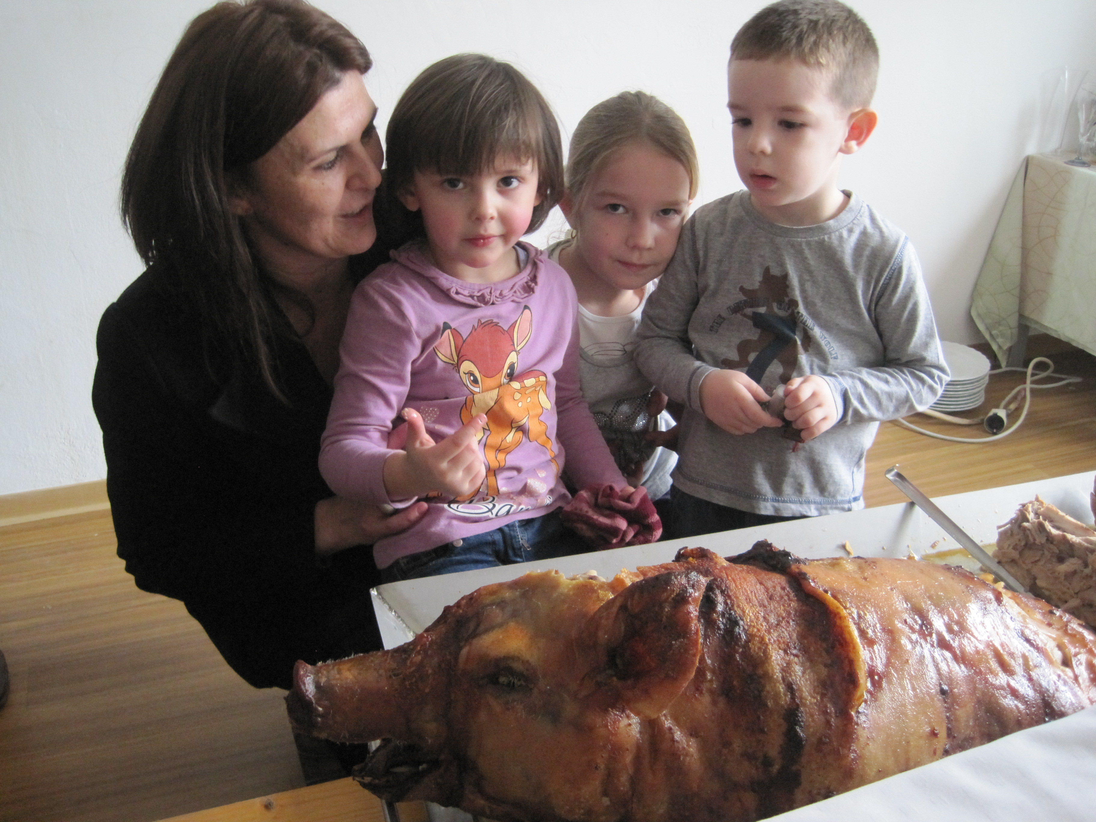 Mia, Anastasija und Stefan bewundern das Spanferkel