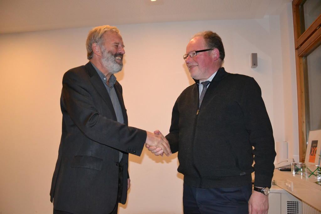 Georg Sporschill (li) bedankt sich für das soziale Engagement und die Unterstützung der Gemeinde Götzis beim Bürgermeister