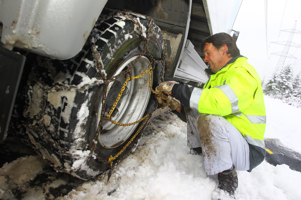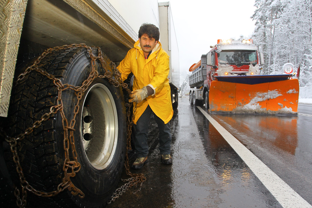 Schneekettenmontage auf der S16 bei Bings