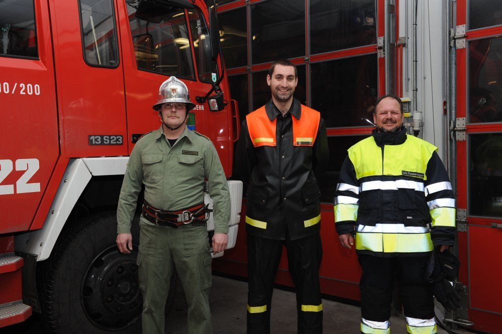 Einsatzbekleidung im Wandel: Die Grüne aus den 70er-Jahren, daneben jene von 1991 und rechts die moderne, neue Einsatzbekleidung der FW Mäder.