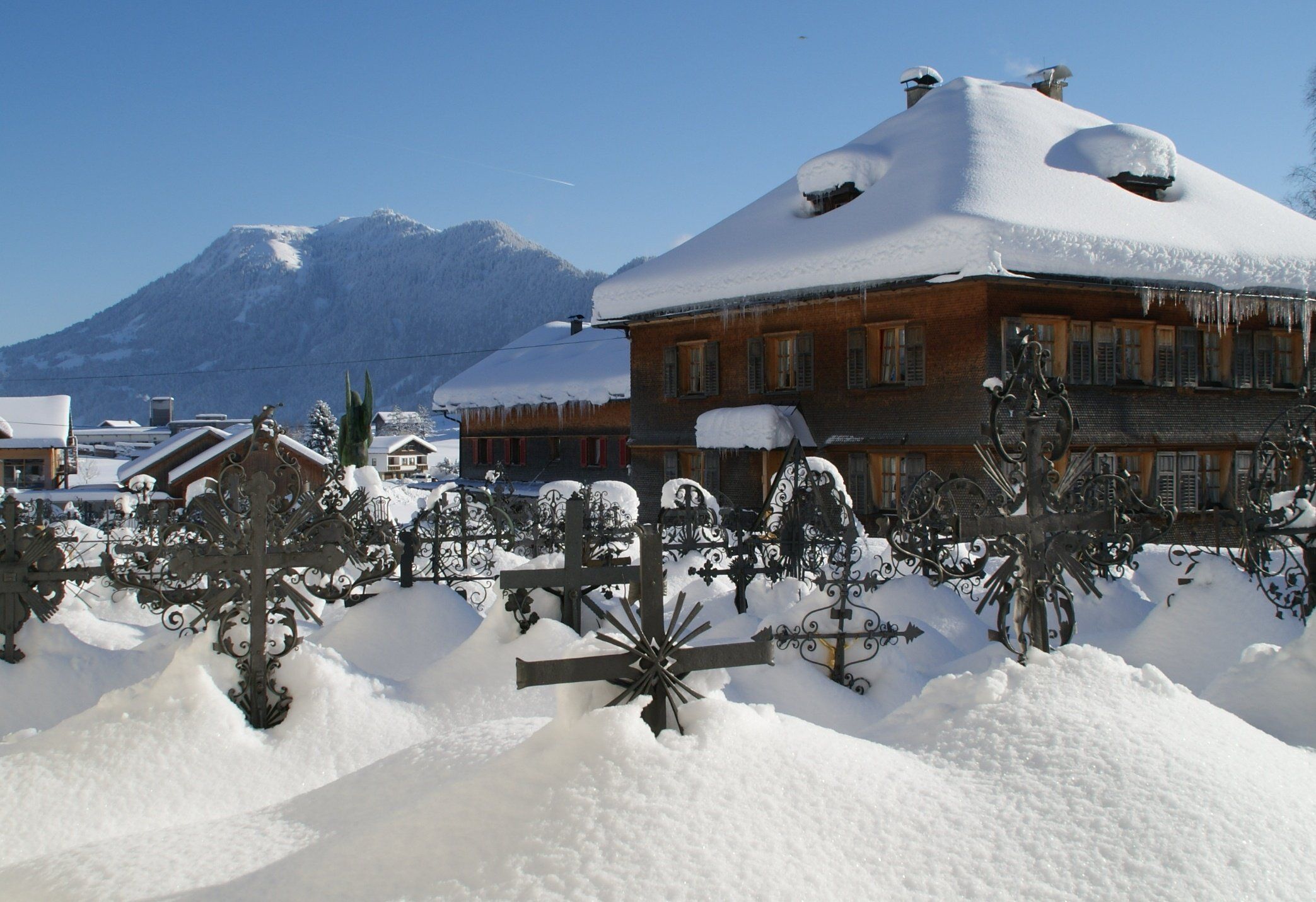 Die schmiedeeisernen Kreuze ragen nur noch wenig aus den tiefen Schnee