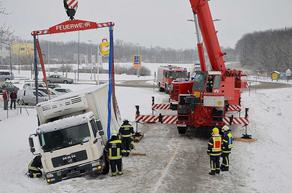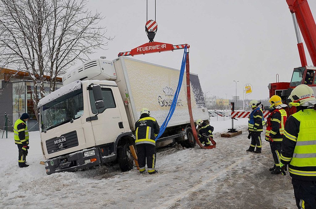 Unfall im Bezirk Mödling: 12-Tonnen-Lkw rutschte in den Graben