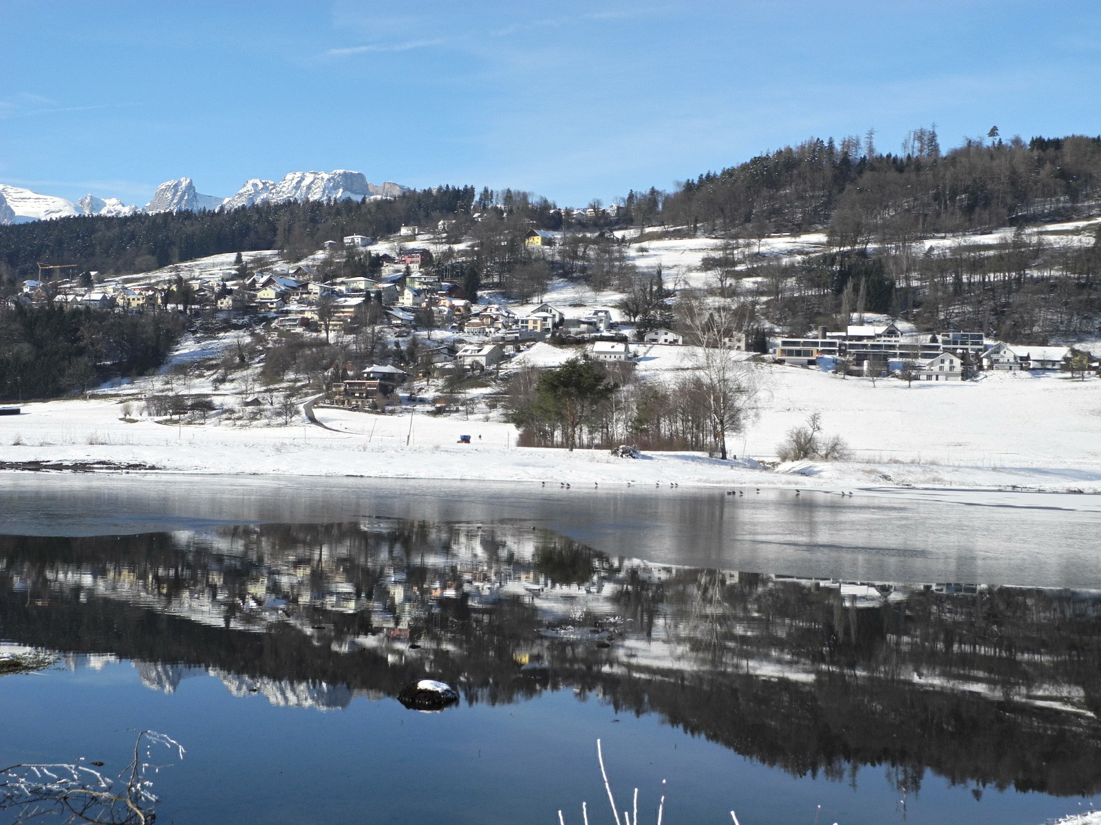 Die Hub mit dem Schellenberg spiegelt sich im Egelsee
