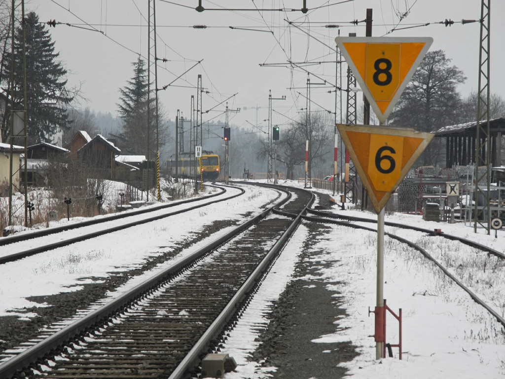 Diese Tafeln zeigen dem Lokführer an, dass er wegen dem schlechten Gleiszustand in einer Entfernung von rund 1000 m (Bremsweg) nur mehr 80 bzw. 60 km/h fahren darf.