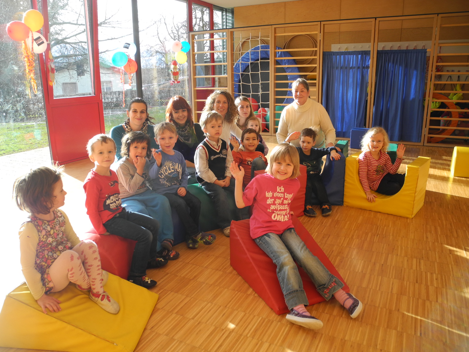 Kindergärtler mit den Pädagoginnen und der Leiterin des Kindergartens Maria Gasser