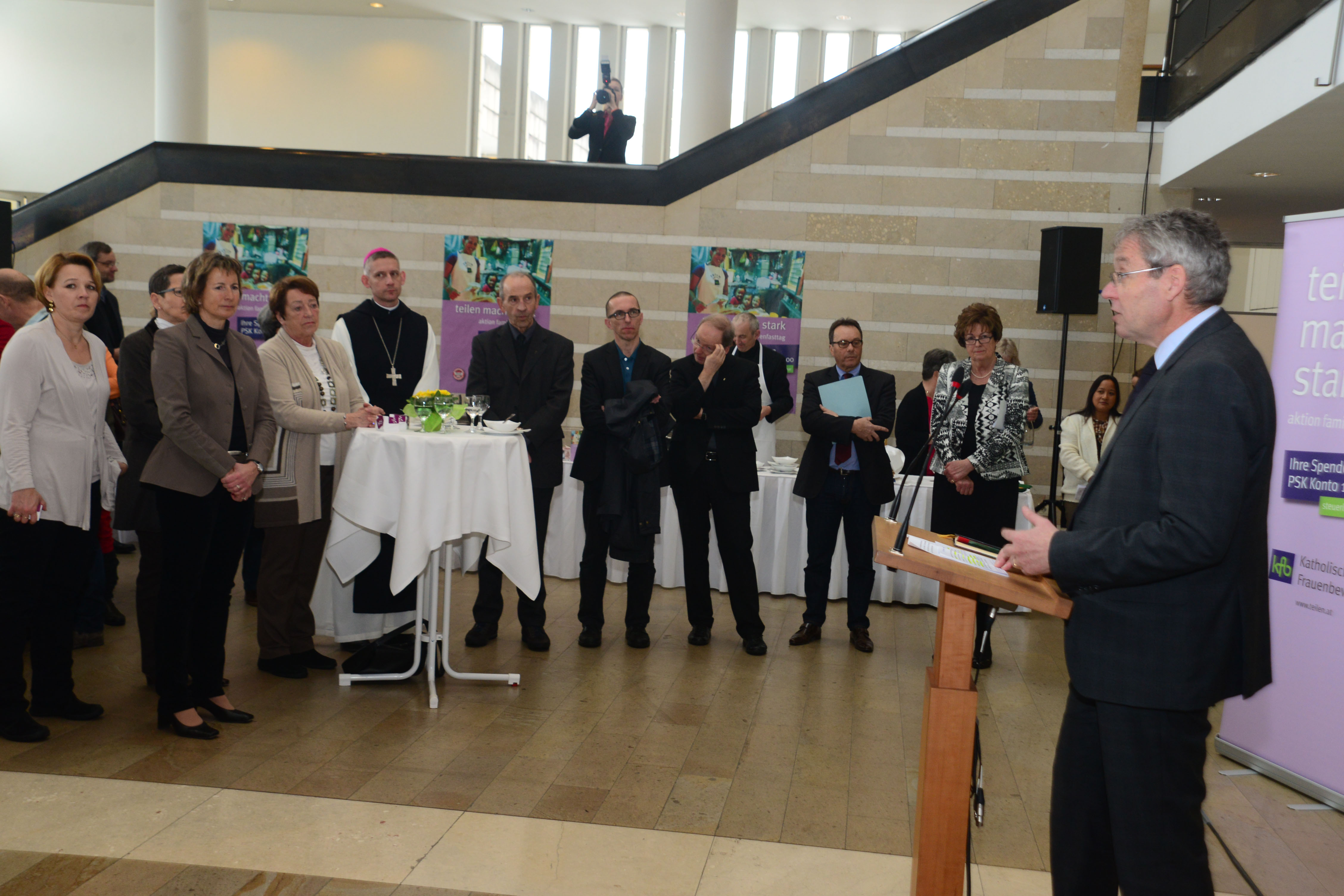 Landesstatthalter Karlheinz Rüdisser informierte über die jähriche Benefizsuppenessen im Landhaus. Im Hintergrund (von links): LR Andrea Kaufmann, LR Greti Schmid, Landtagspräsidentin Gabriele Nußbaumer, Bundesministerin a.D. Elisabeth Gehrer, Pater Abt Anselm von der Linde, Stadtpfarrer Anton Bereuter, Pastoralamtsleiter Walter Schmolly, Diözesanadministrator Benno Elbs, Gerhard Hagen, Marlies Müller (Kath. Frauenbewegung).