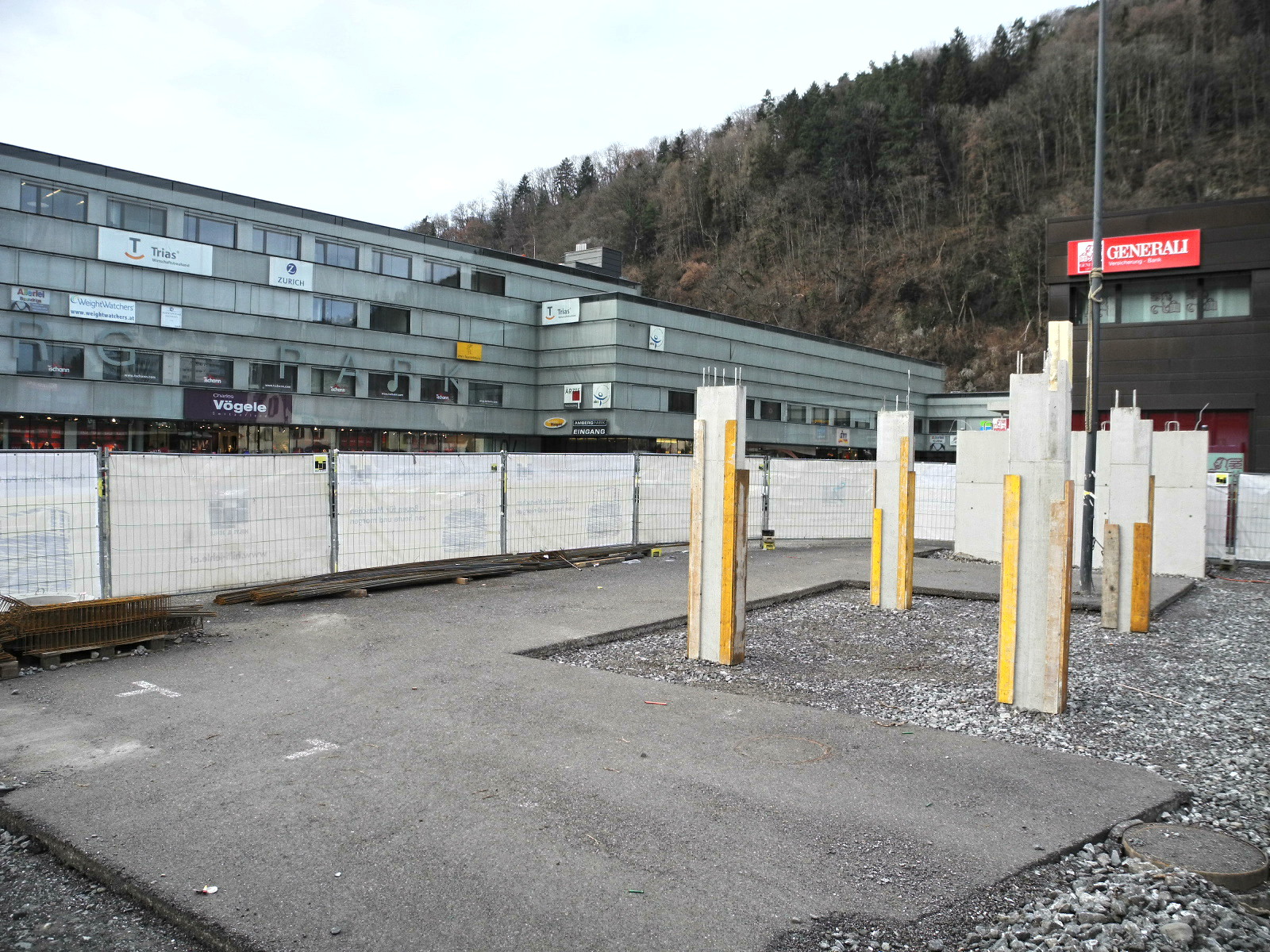 Das neue Gebäude wurde auf diesen rechteckigen Säulen aufgesetzt
