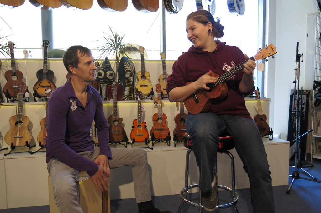 Melissa versucht sich auf der Ukulele