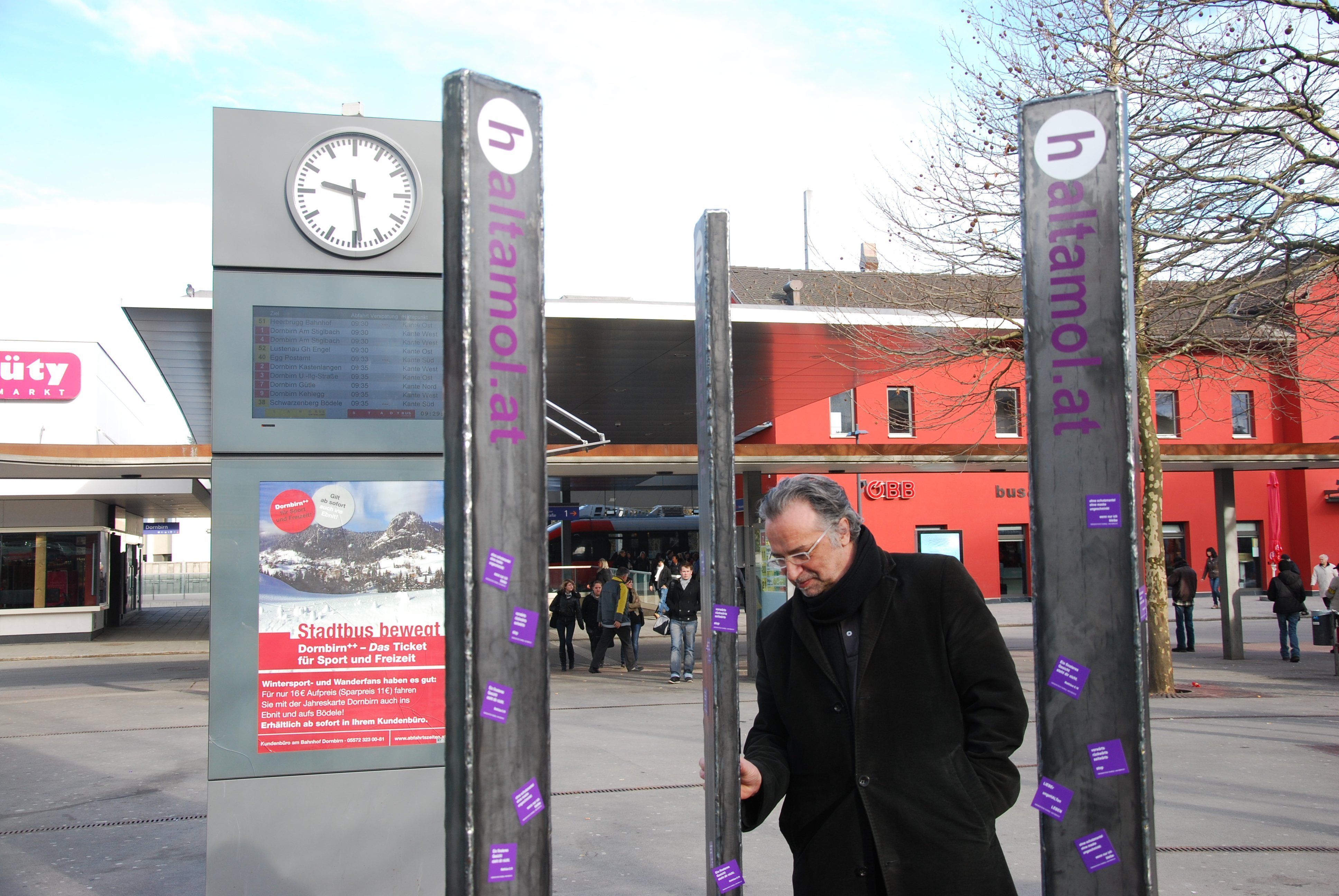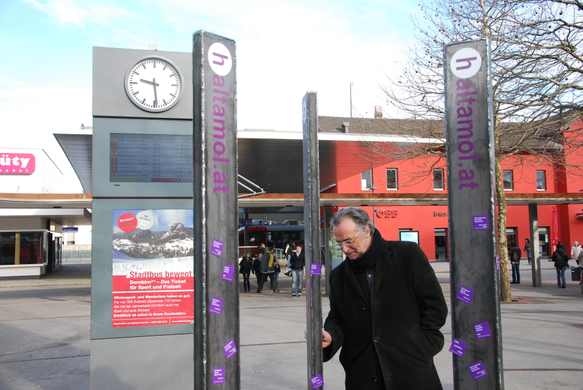 "Hinter jeder der 3 Haltestellensäulen steht eine Verbindung von Mensch, Raum und Zeit."; so Wolfgang Ritsch.