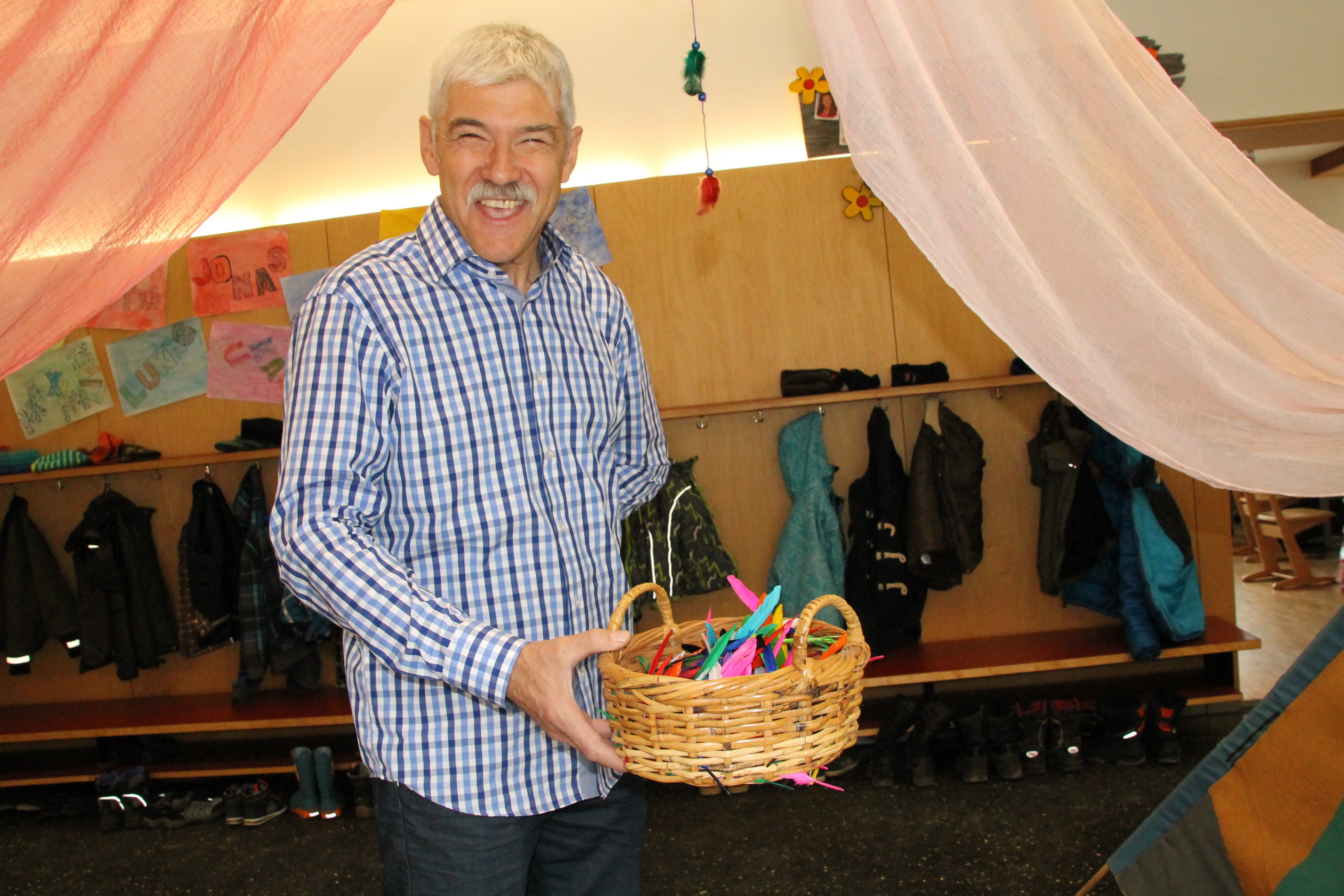 Direktor Helmut Müller mit bunten Indianerfedern.